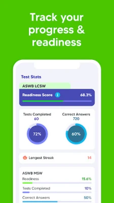 Additionally, our mobile app provides a personalized study plan based on your skill level, study frequency, and target test date. Not sure when you want to take the exam? You can adjust your study plan as often as you like. Our proprietary readiness score will help you determine when you’re ready to take the real Association of Social Work Boards exam and pass with a high score on your first try.
