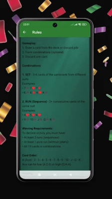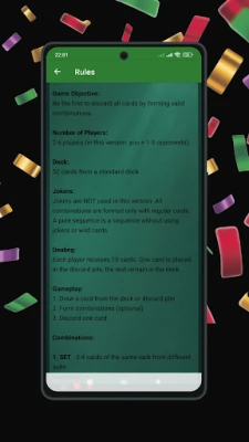 Here you will find detailed rules of the game, with the smallest details, and you can practice this simple yet complex game with one, two, or three players. You will easily understand the basics after a few games, and the simple controls will keep you from getting confused by the details. Collect runs and sets, pay attention to discards, and sometimes just get lucky so you don't discard something that might be useful in later combinations. This interesting game will not leave you indifferent to Rummy-style games, help you get used to them, and help you enjoy your free time!